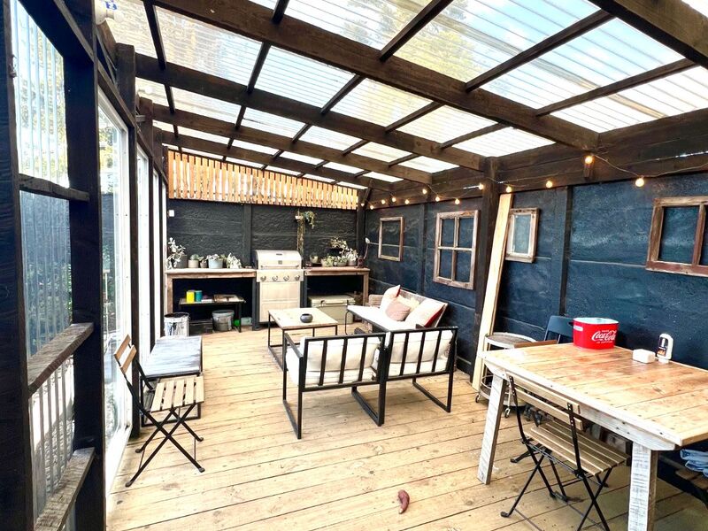 Terraza con quincho de 20m2. Deck de madera y laterales vidriados, con muebles integrados en madera nativa reciclada. Incluye iluminación y parrilla a gas.